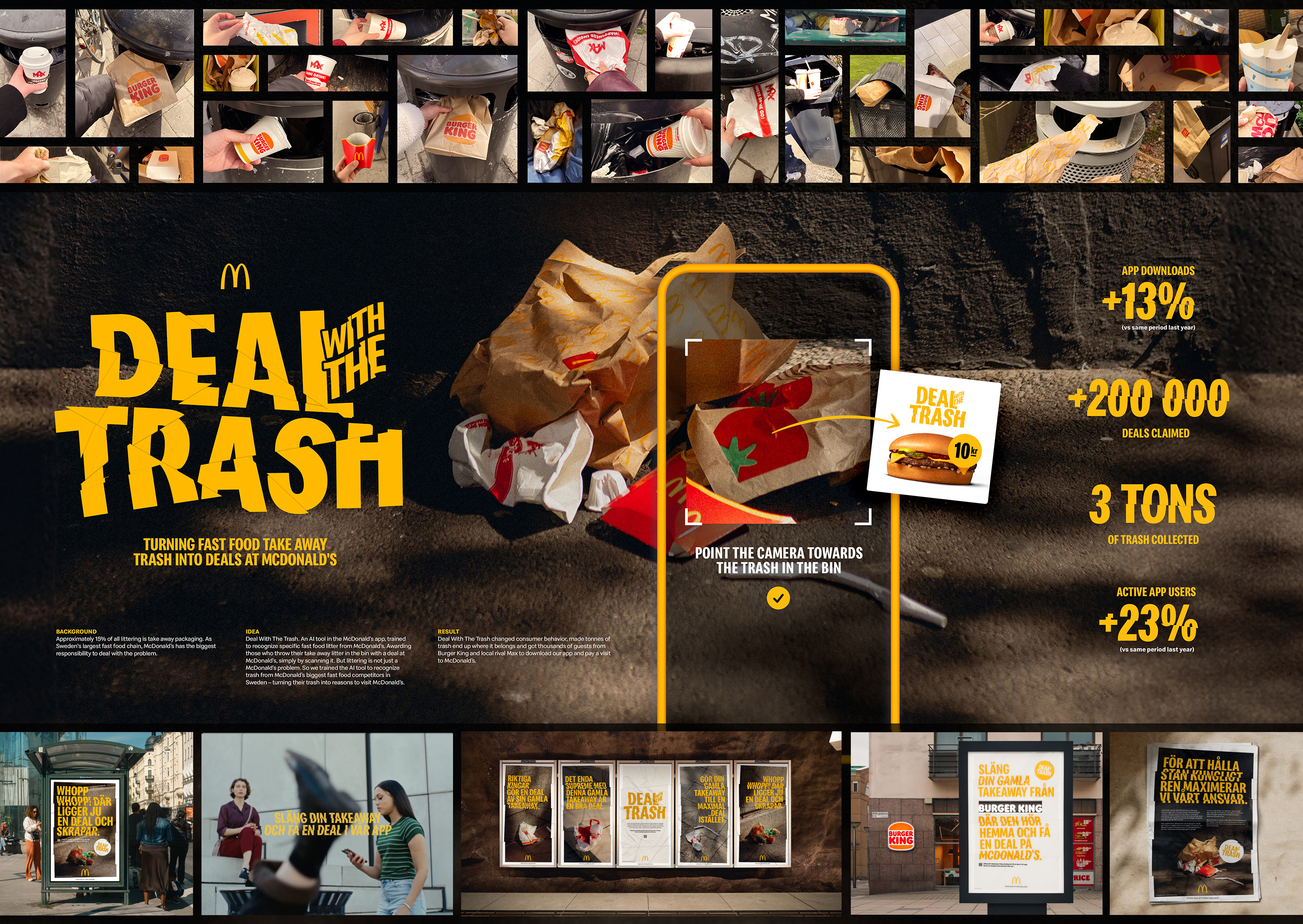 Med Deal With The Trash vändes logiken. I stället för att belöna köp belönades ansvar. När människor slängde sitt take away‑skräp på rätt plats kunde förpackningen scannas i McDonald’s app och direkt låsa upp ett erbjudande. För att sänka trösklar och öka trovärdighet inkluderades även två stora konkurrenters förpackningar. Nedskräpning behandlades som ett beteendeproblem i kategorin, inte som ett varumärkesproblem.
