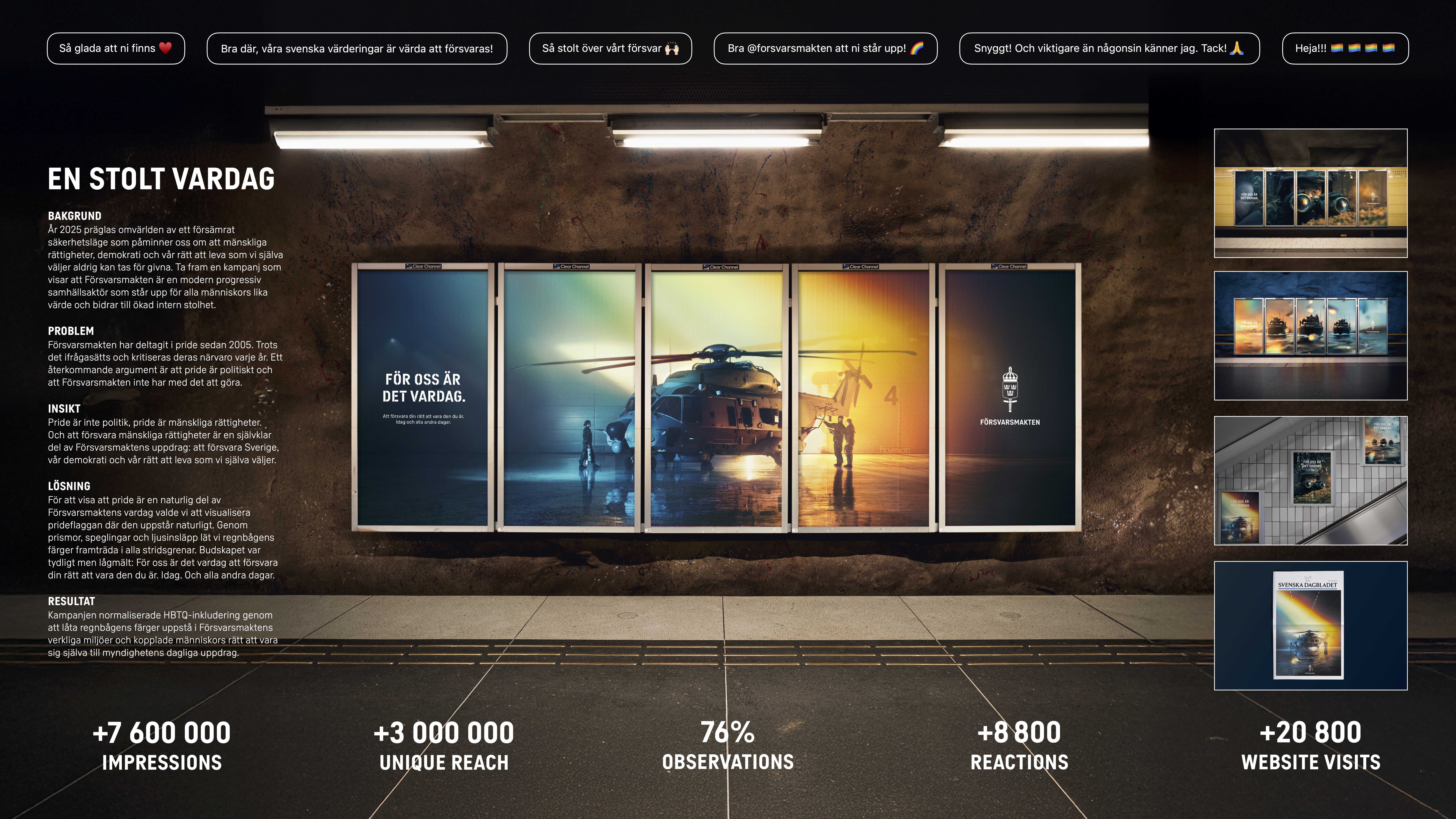 En stolt vardag: För att visa att pride är en naturlig del av Försvarsmaktens vardag valde vi att visualisera prideflaggan där den uppstår naturligt. Genom prismor, speglingar och ljusinsläpp lät vi regnbågens färger framträda i alla stridsgrenar. Flygvapnet, marinen och armén. På marken, på havet och i luften. Budskapet var tydligt men lågmält: För oss är det vardag att försvara din rätt att vara den du är. Idag. Och alla andra dagar.