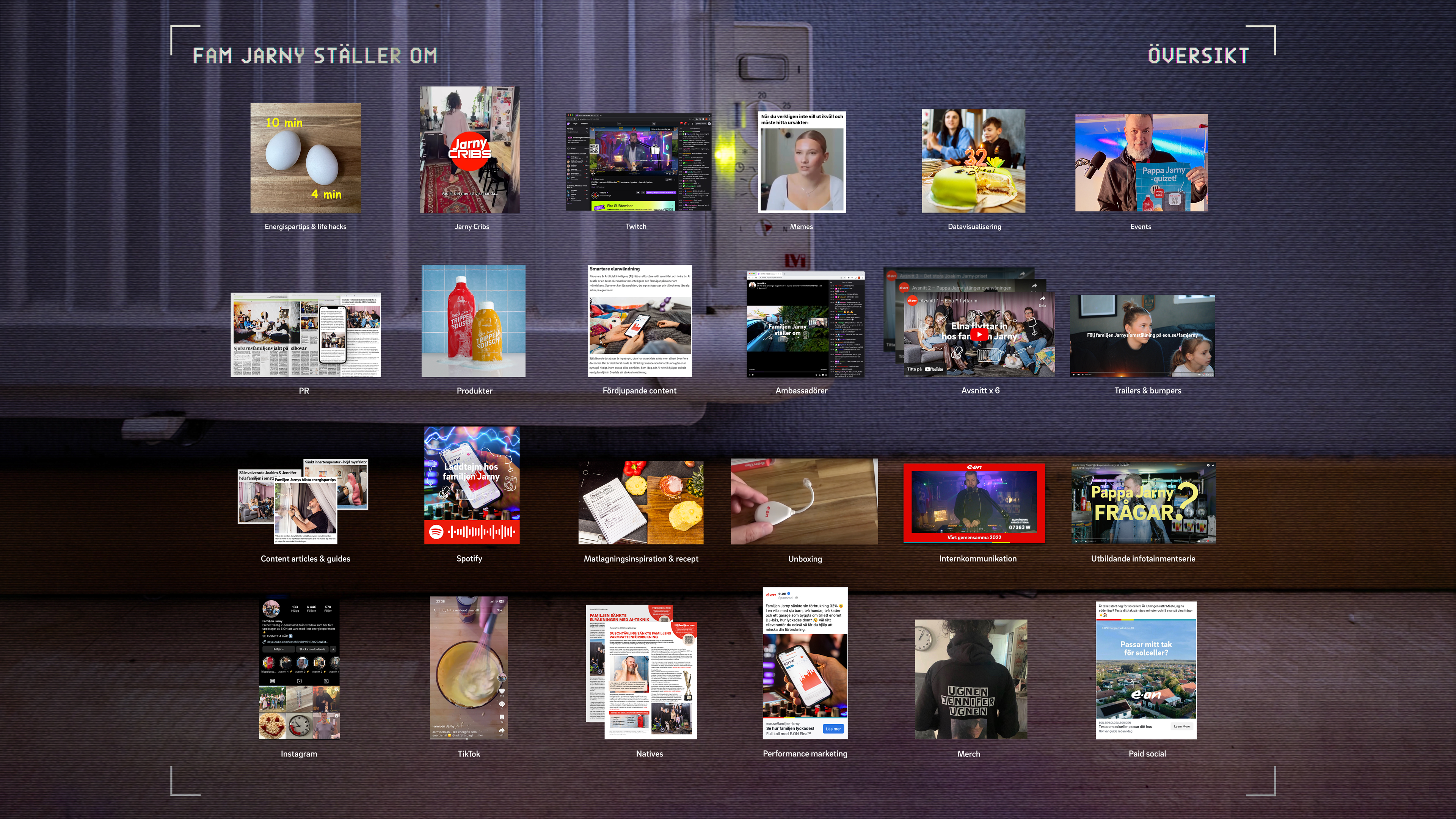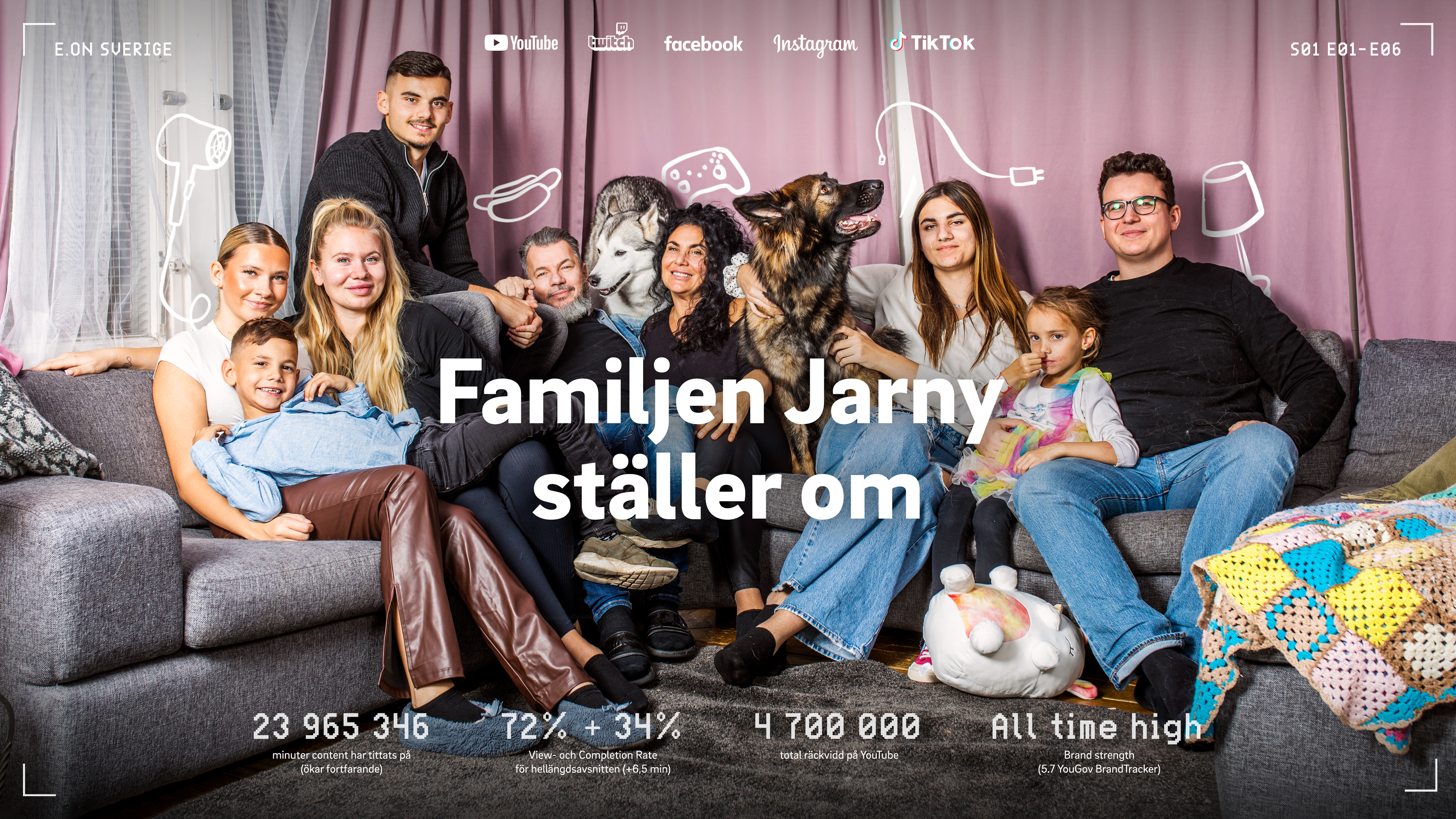 Sagt och gjort. Vi skapade en realityserie där vardagen hos en helt (o)vanlig familj förvandlas till en dokusåpa på YouTube. Ett 100 % autentiskt energiexperiment där vi möter familjen Jarny: en sjubarnsfamilj från Svedala som bor i ett hus med skärmar i varje rum, minikylar, popcorn- och korvmaskiner samt ”Pappa Jarnys” fullt utrustade DJ-garage.