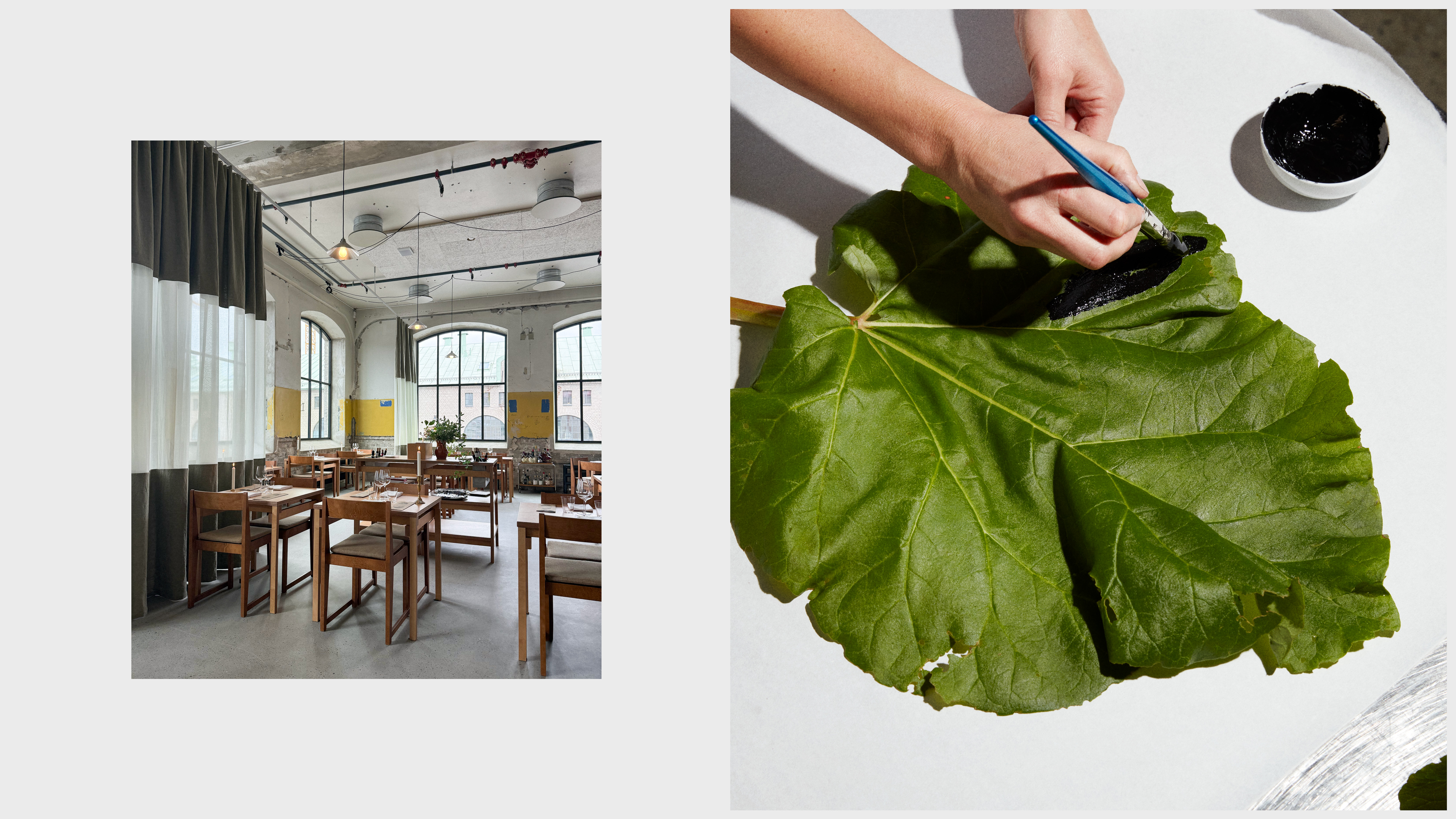 Lokalen fortsätter samma berättelse. Slakthusområdets industriella historia får vara kvar – råa väggar, öppna ytor, enkla material. Specialritade bord och gardiner ramar in rummet utan att ta över. Allt är byggt för att ge plats åt det viktigaste: maten och råvarorna.