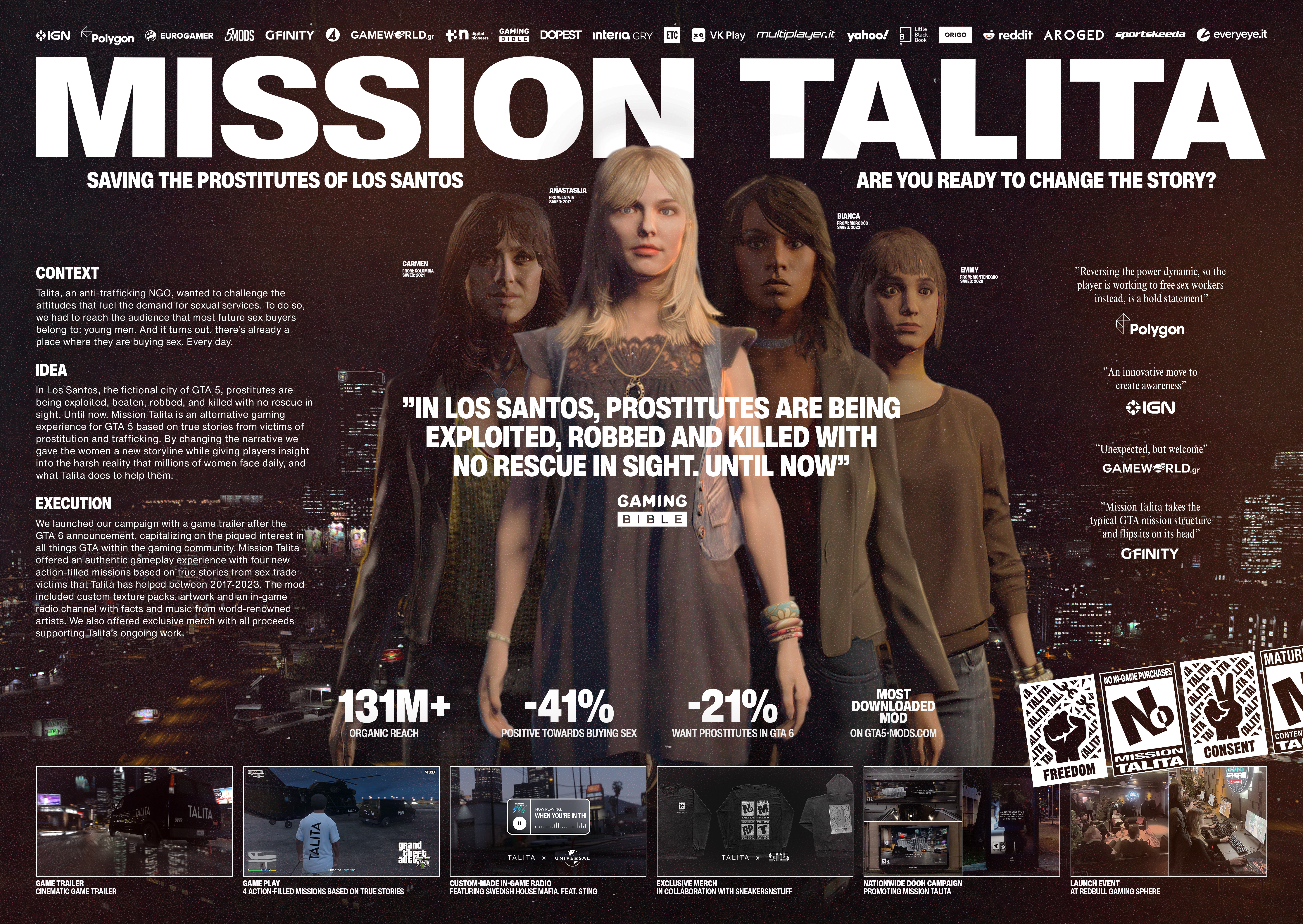 Mission Talita är en modifierad spelupplevelse för GTA 5, med fyra actionfyllda uppdrag baserade på verkliga berättelser från kvinnor som Talita har räddat från prostitution mellan 2017 och 2023. Genom att vända på narrativet gav vi de prostituterade karaktärerna bakgrundshistorier, och spelarna en insikt i den brutala verklighet som kvinnor i sexhandeln möter dagligen.
