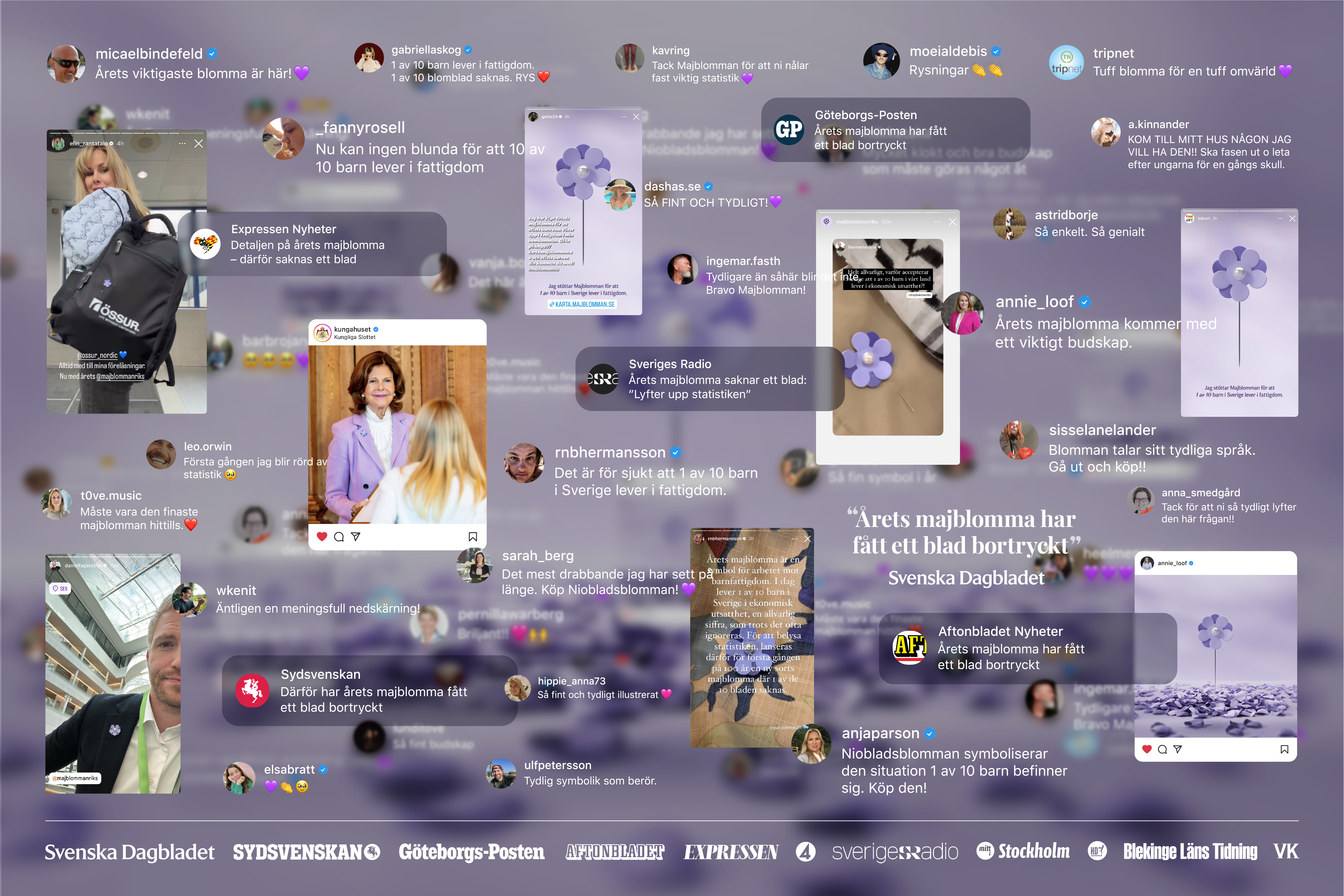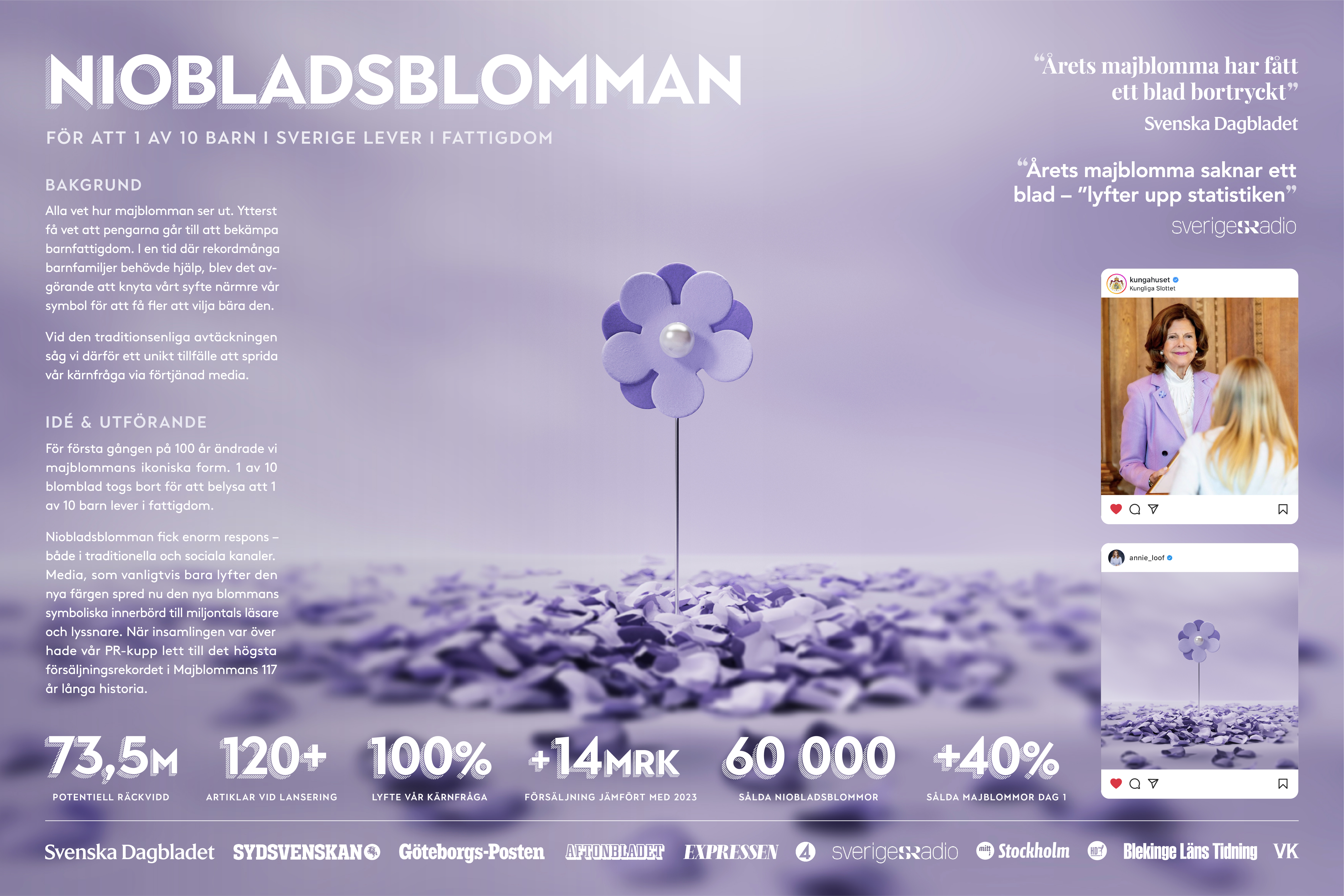Lösningen blev Niobladsblomman. Genom att ta bort ett av blommans tio blad skapades en tydlig visualisering av statistiken: 1 av 10 barn lever i fattigdom. En liten förändring av en ikonisk symbol som gjorde stor skillnad för försäljningen och produkten i sig till bärare av Majblommans syfte. När blomman dessutom lanserades på årets fattigaste dag fick medierna en tydlig och relevant berättelse att sprida. I stället för att, som tidigare år, fokusera på färgval, kom nyhetsrapporteringen att handla om barnfattigdom och Majblommans arbete.