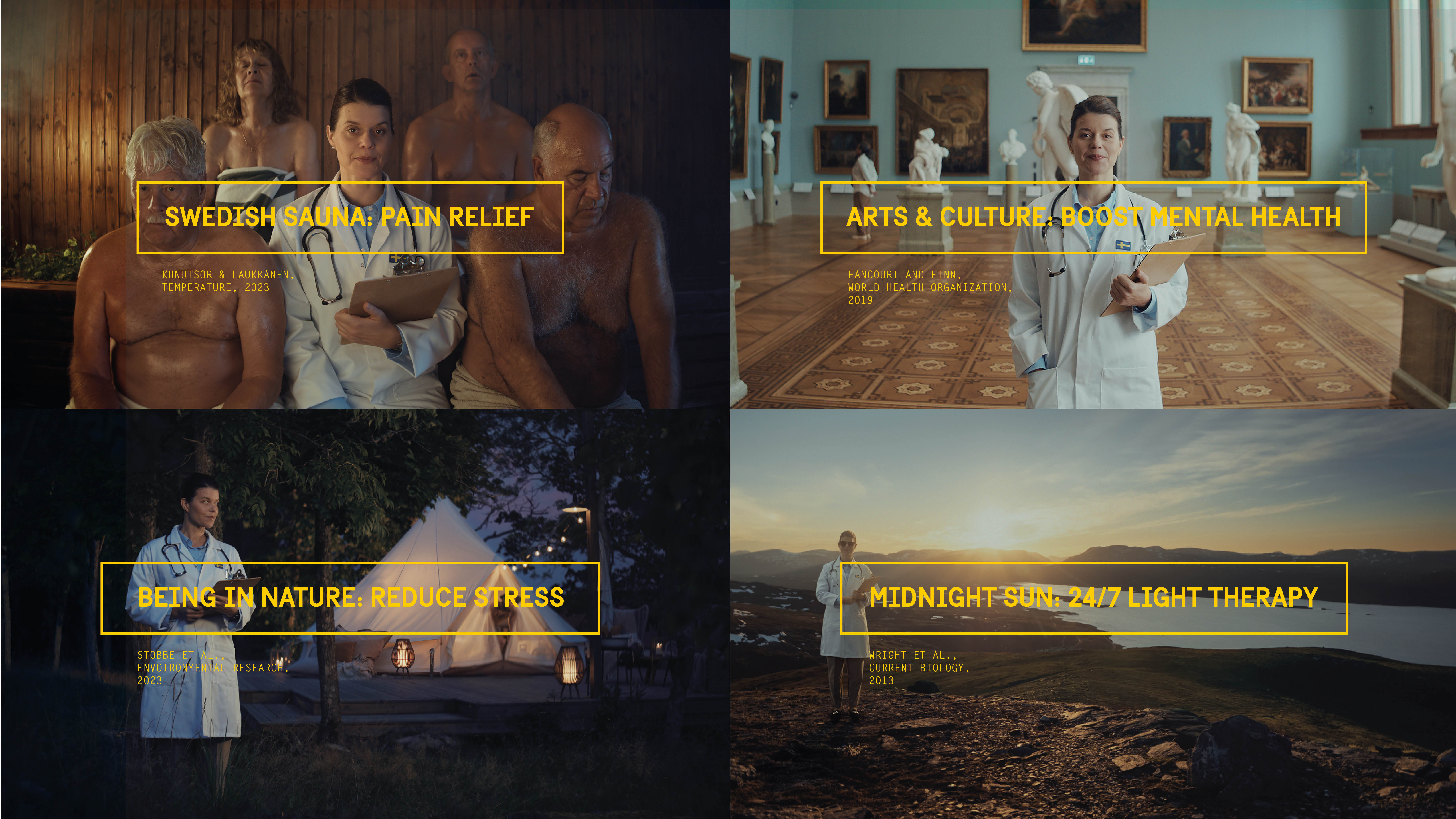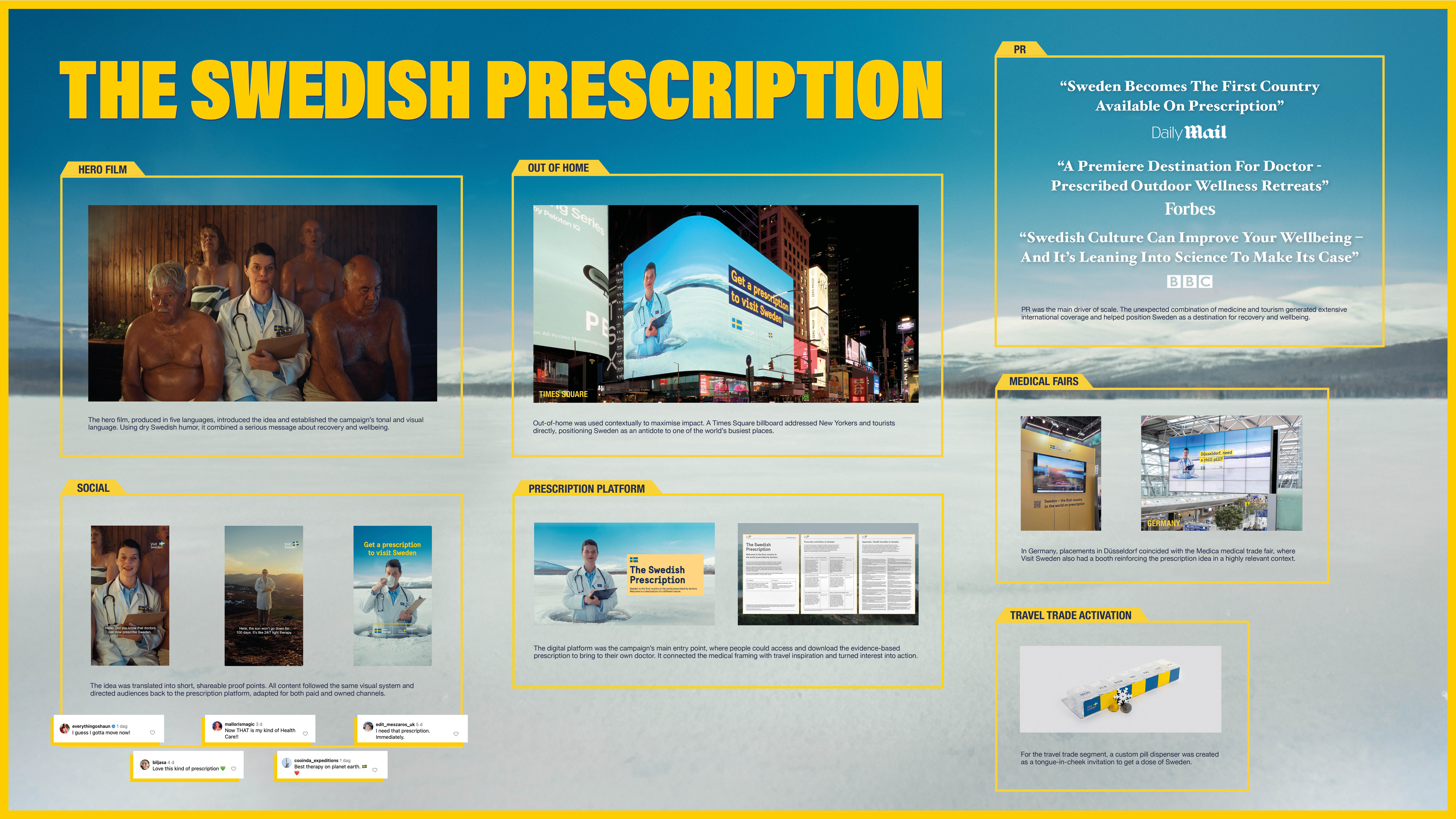 The Swedish Prescription samlade klassiska svenska aktiviteter som isbad, bastu, fika, lugna kulturupplevelser och midnattssol, och beskrev deras vetenskapliga effekter via en digital plattform anpassad för både läkare och besökare.