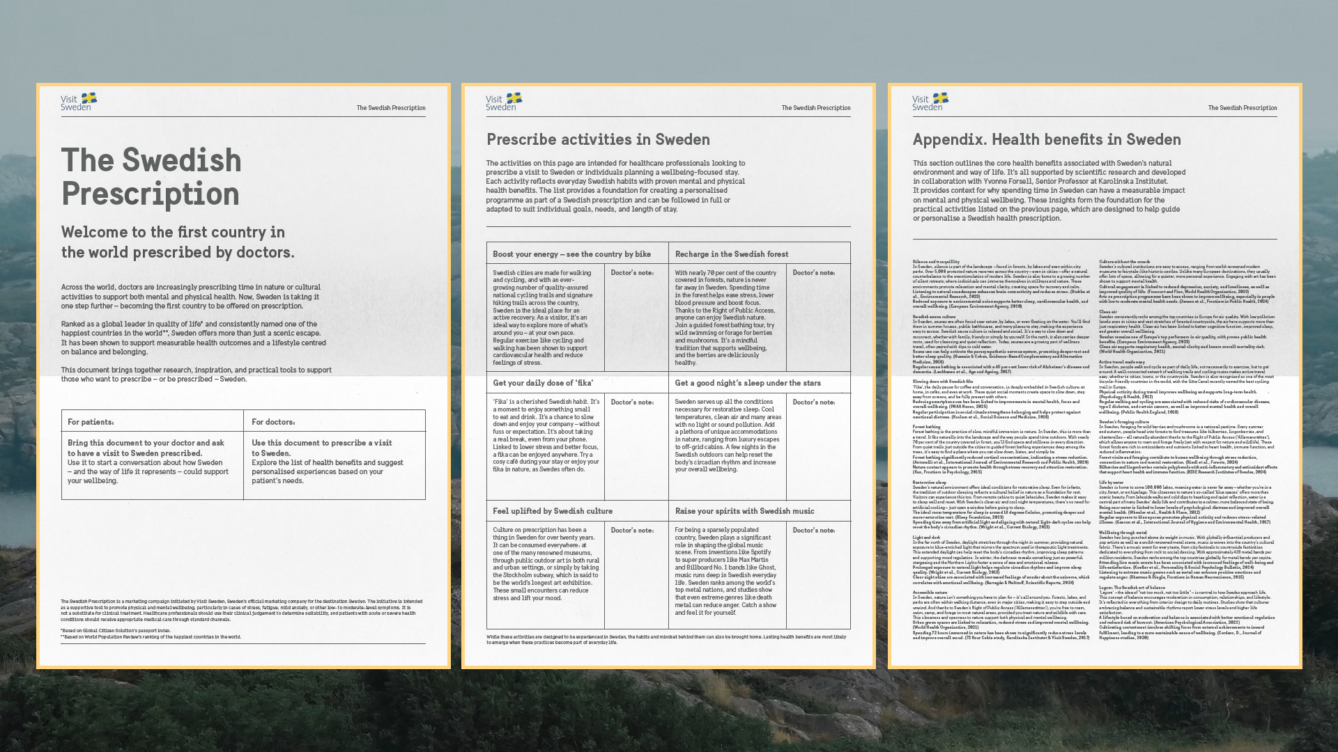 Lösningen blev The Swedish Prescription – en idé som utvecklades tillsammans med Yvonne Forsell, senior professor vid Karolinska Institutet, som bidrog med den vetenskapliga ramen för hur den svenska livsstilen påverkar mental och fysisk hälsa.