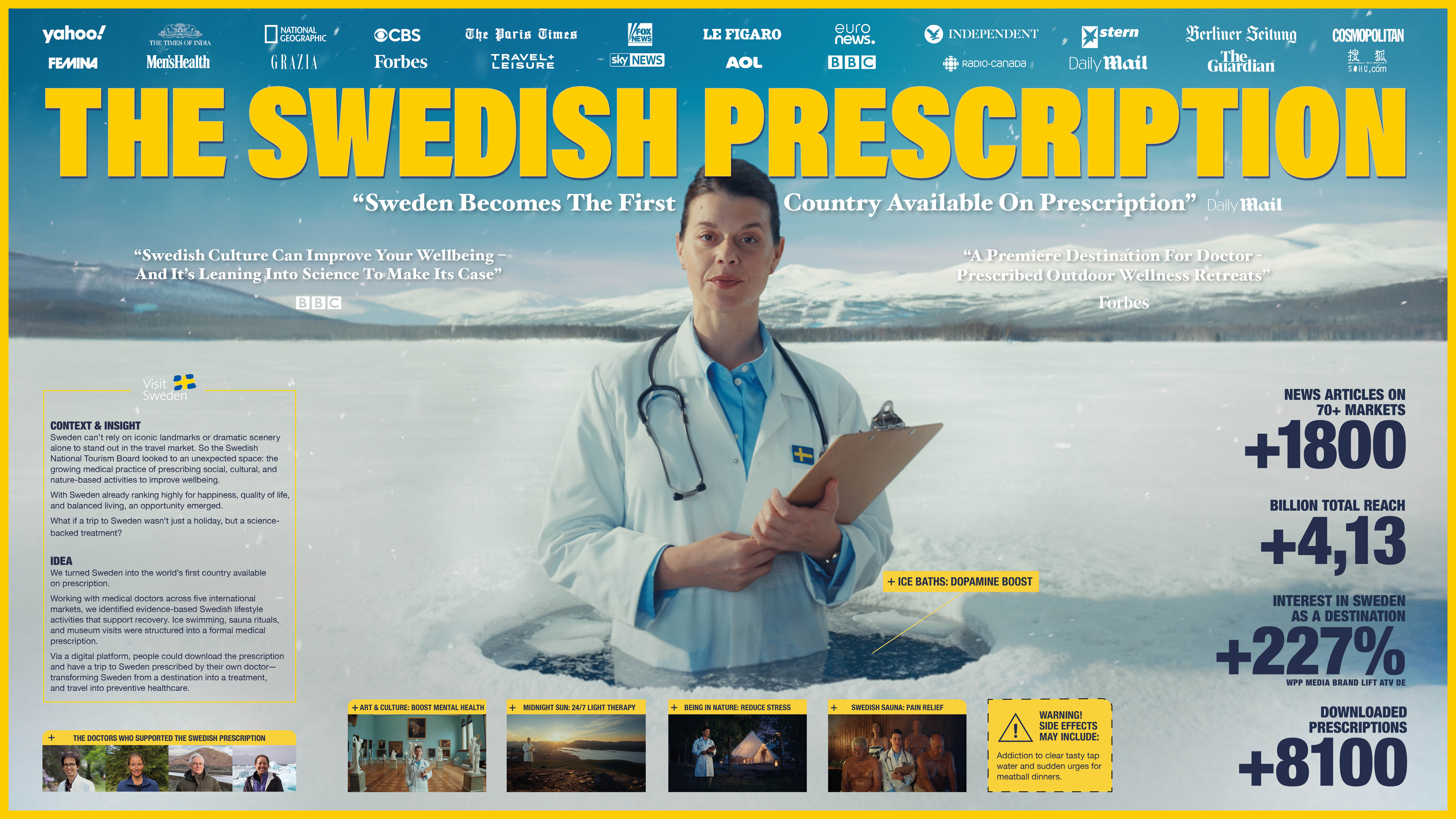 The Swedish Prescription samlade klassiska svenska aktiviteter som isbad, bastu, fika, lugna kulturupplevelser och midnattssol, och beskrev deras vetenskapliga effekter via en digital plattform anpassad för både läkare och besökare.