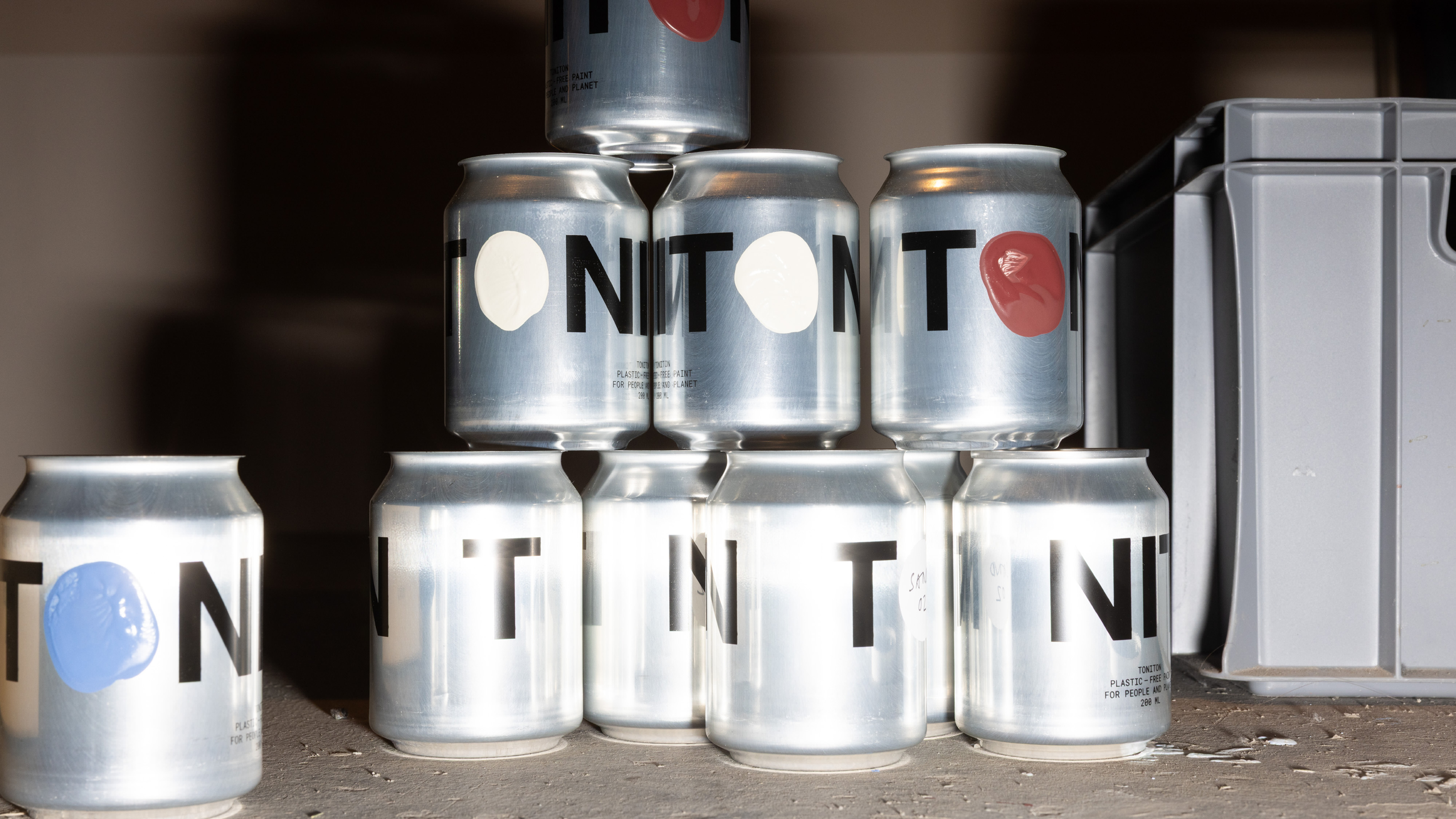 Och så logotypen. Tonitons två o:n har blivit runda prickar. Små cirklar av färg eller klistermärken som inte bara pryder burken — utan berättar exakt vad som finns inuti. Varje burk märks med sin kulör, tydligt och lekfullt på samma gång.