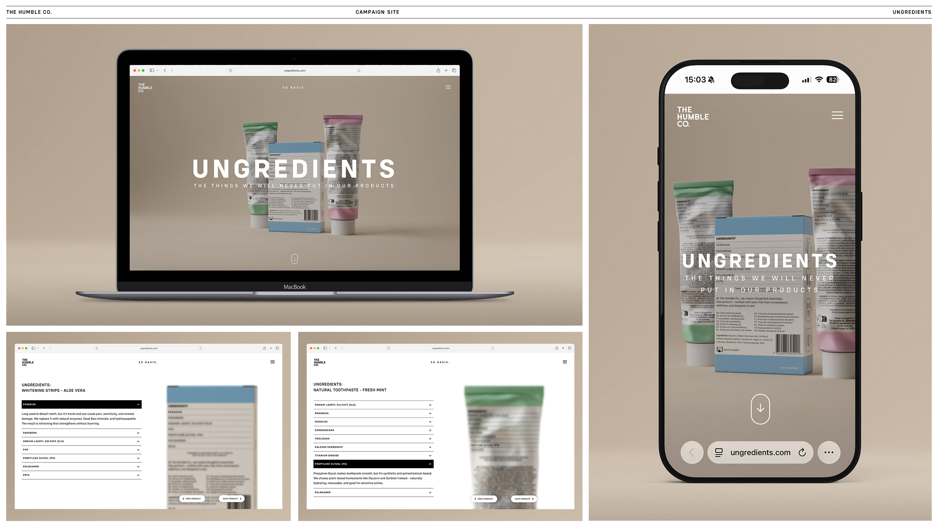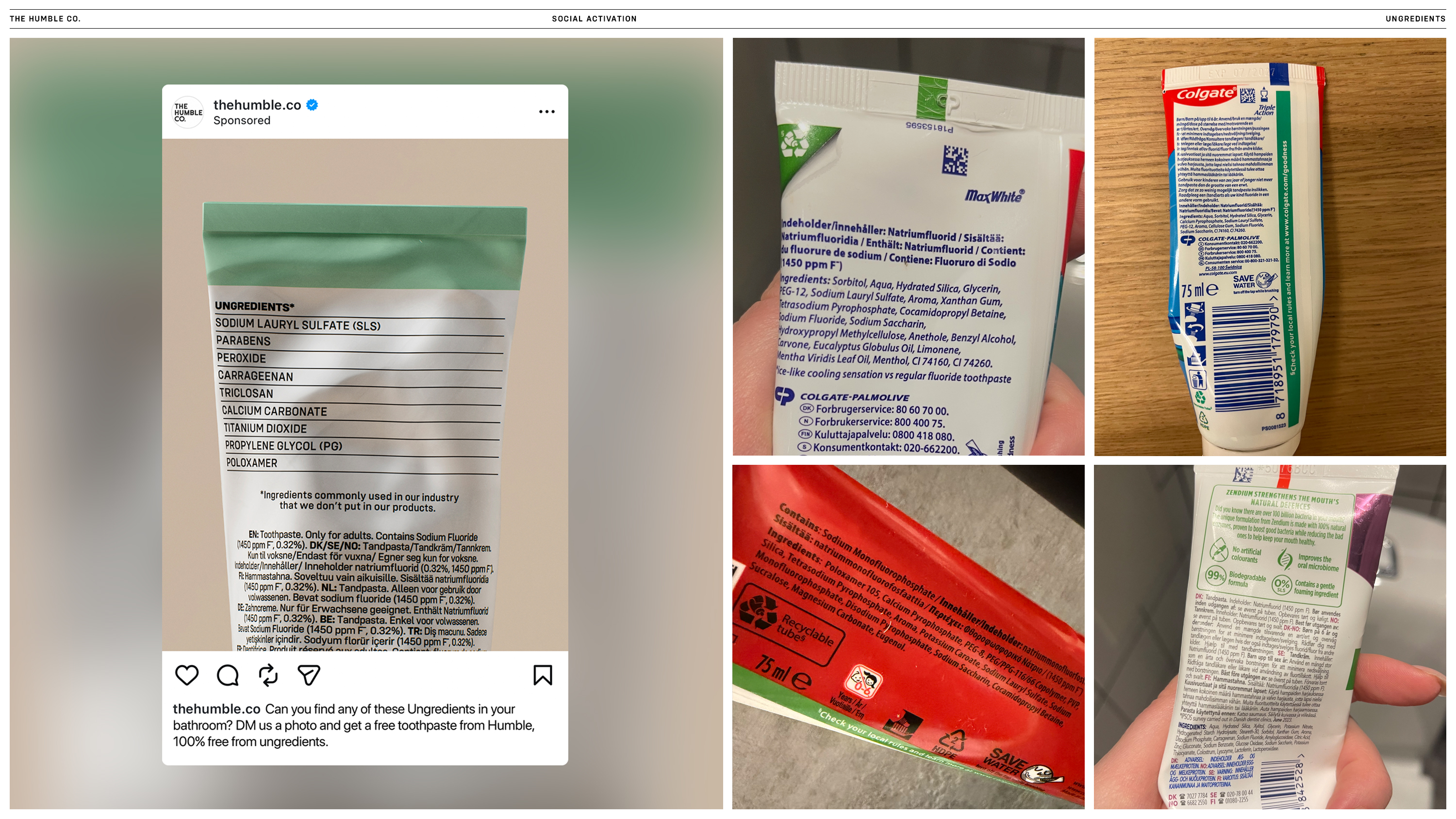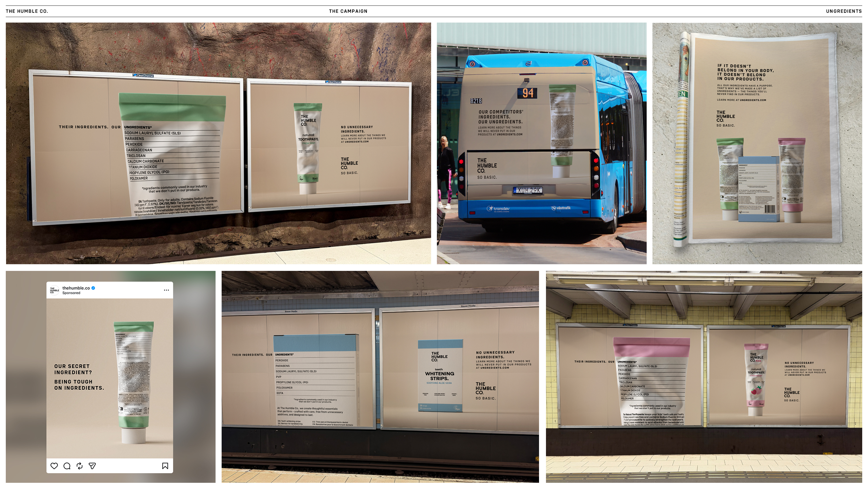Som ett initiativ för att påskynda omställningen i munvårdskategorin lanserade The Humble Co. Ungredients – världens första ingredienslista över ämnen som ofta förekommer i munvårdsprodukter, men aldrig i The Humble Co:s. En lista över ingredienser som valts bort. Listan trycktes direkt på The Humble Co:s förpackningar och fungerade som navet i hela kampanjen. Genom att synliggöra elva onödiga eller potentiellt skadliga ingredienser, och förklara varför de inte behövs, omdefinierades vad en ingredienslista kan vara: ett verktyg för utbildning och mer medvetna val.